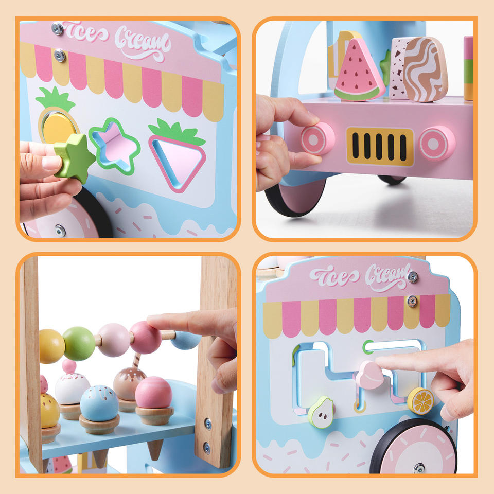 Antepremergator din lemn pentru bebelusi – Carut cu inghetata 3 in 1, sortator, abac