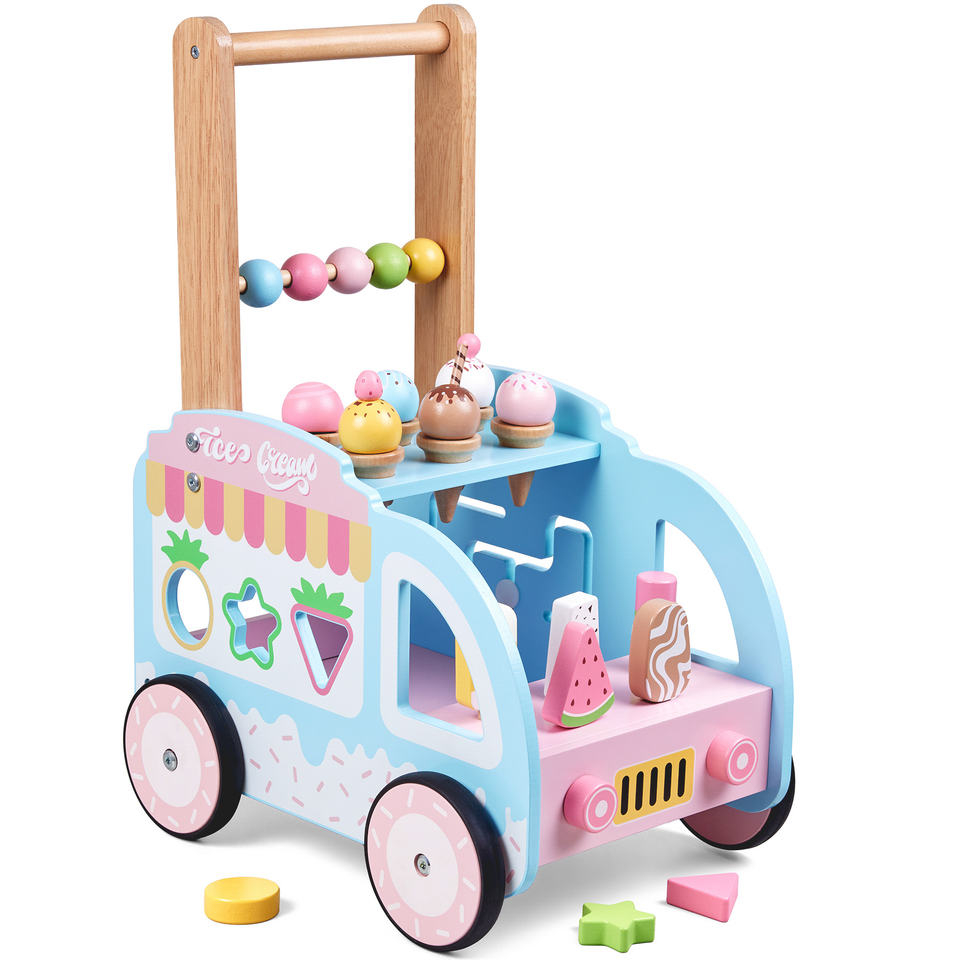AntePremergător din lemn 3 în 1, căruț cu înghețată, sortator și abac – jucărie educativă pentru primii pași ai copilului.