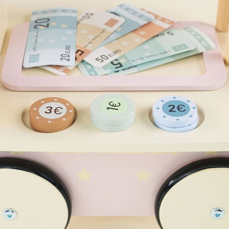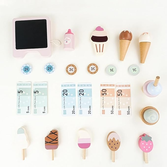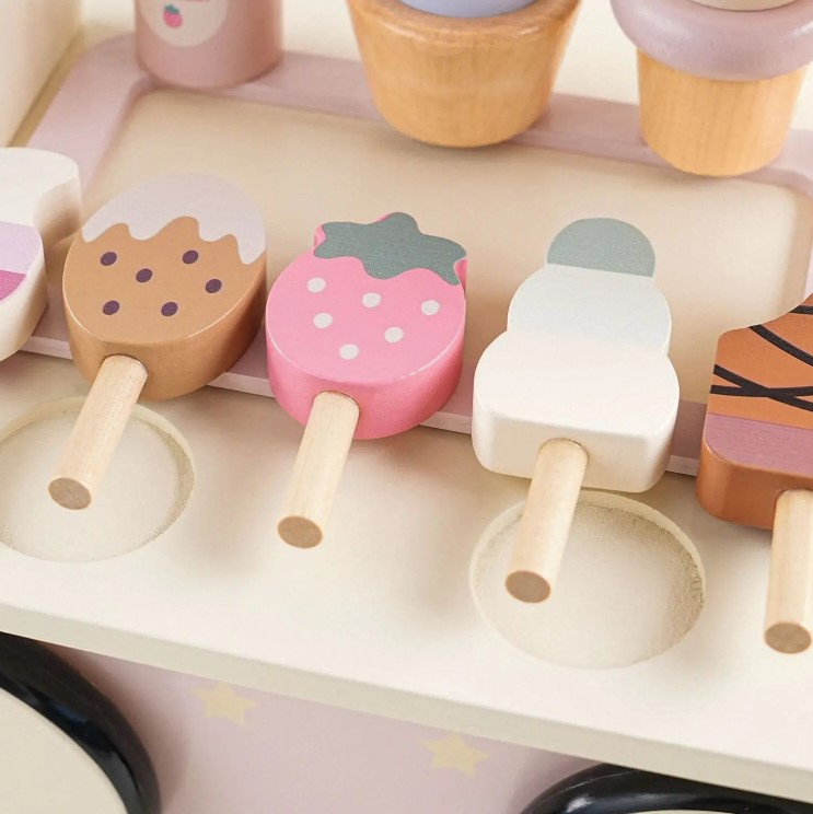 Realizat din lemn natural , colorat în nuanțe pastelate, acest set adorabil oferă copiilor ocazia de a veni mici vânzători de înghețată, dezvoltând în același timp imaginația, abilitățile sociale și motricitatea fină.