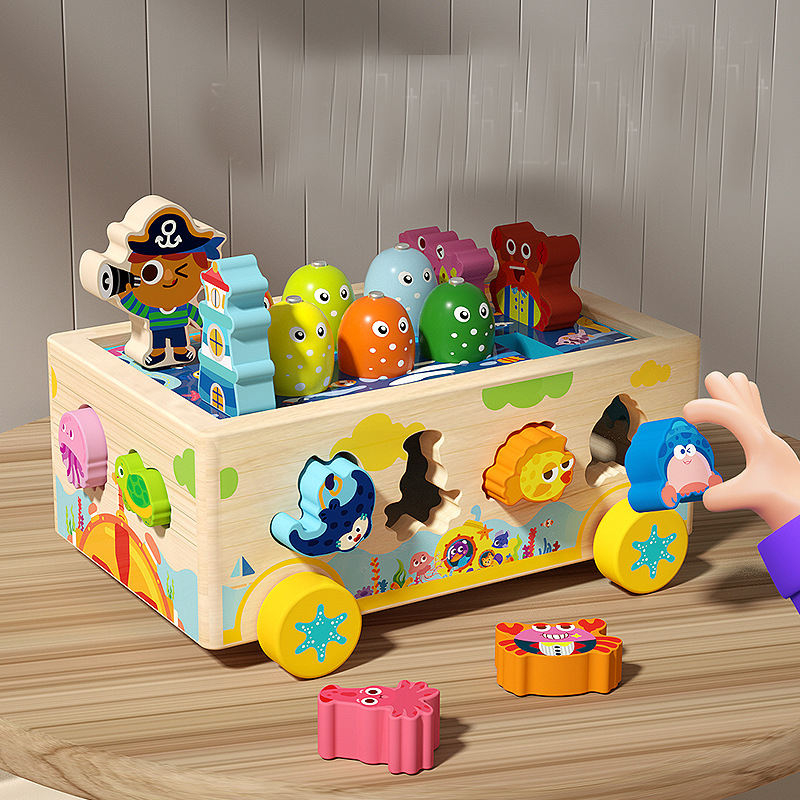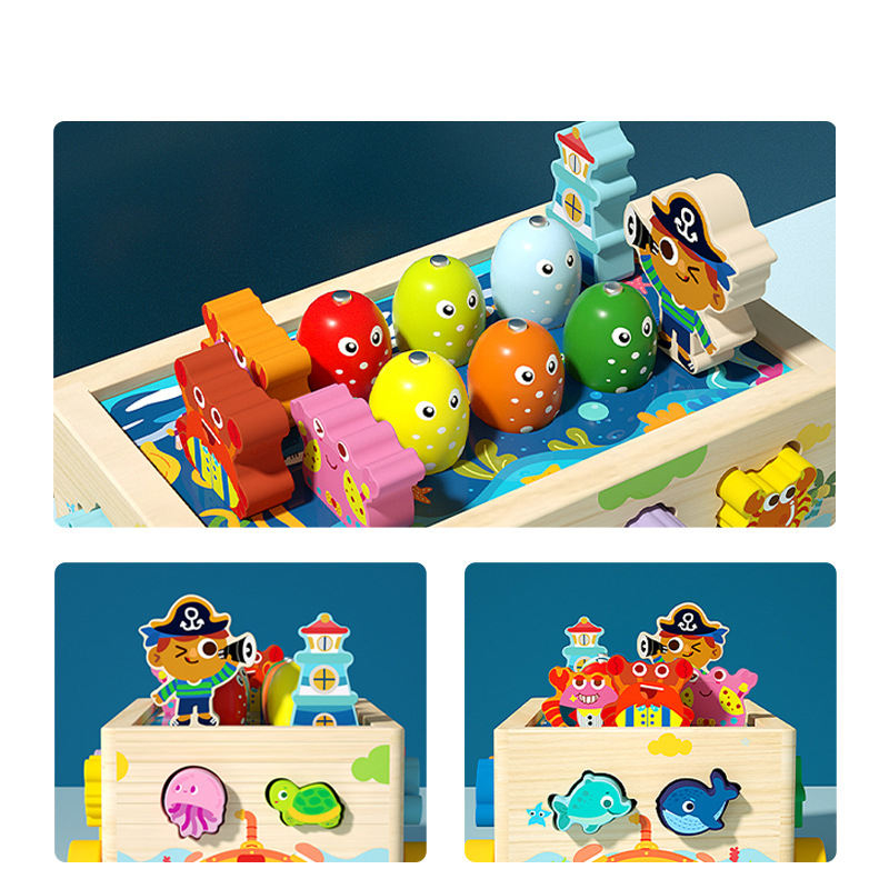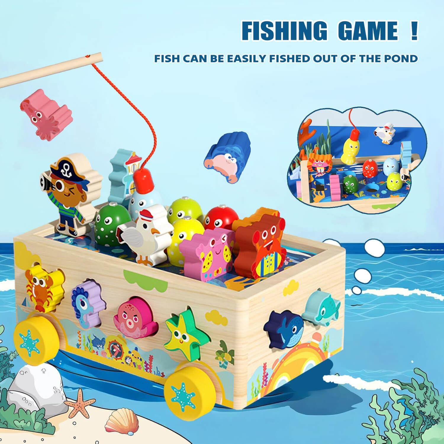 Nume Articol: Jucărie Montessori din lemn – Masina de pescuit magnetica si sortare forme, tema oceanica