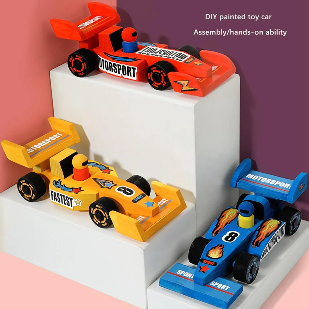 Nume Articol: Set Masini din Lemn de Asamblat si Pictat – 3 Kituri DIY cu Vopsele, Pensule si Autocolante
