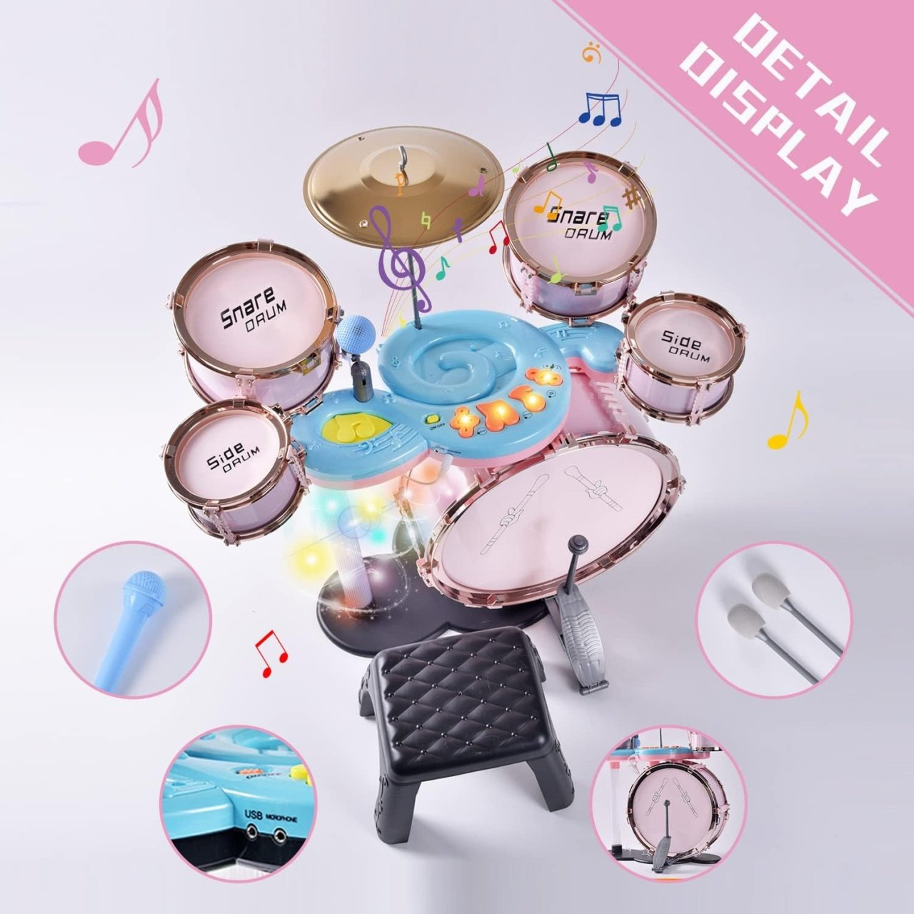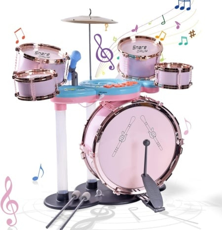 Nume Articol: Set Tobe de Jazz Pentru Copii cu Microfon, Cinel, Pedala si Scaunel Roz