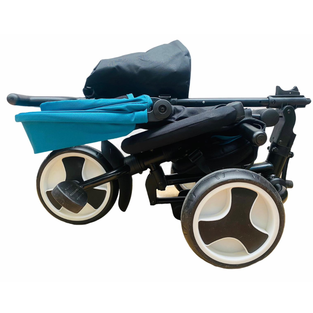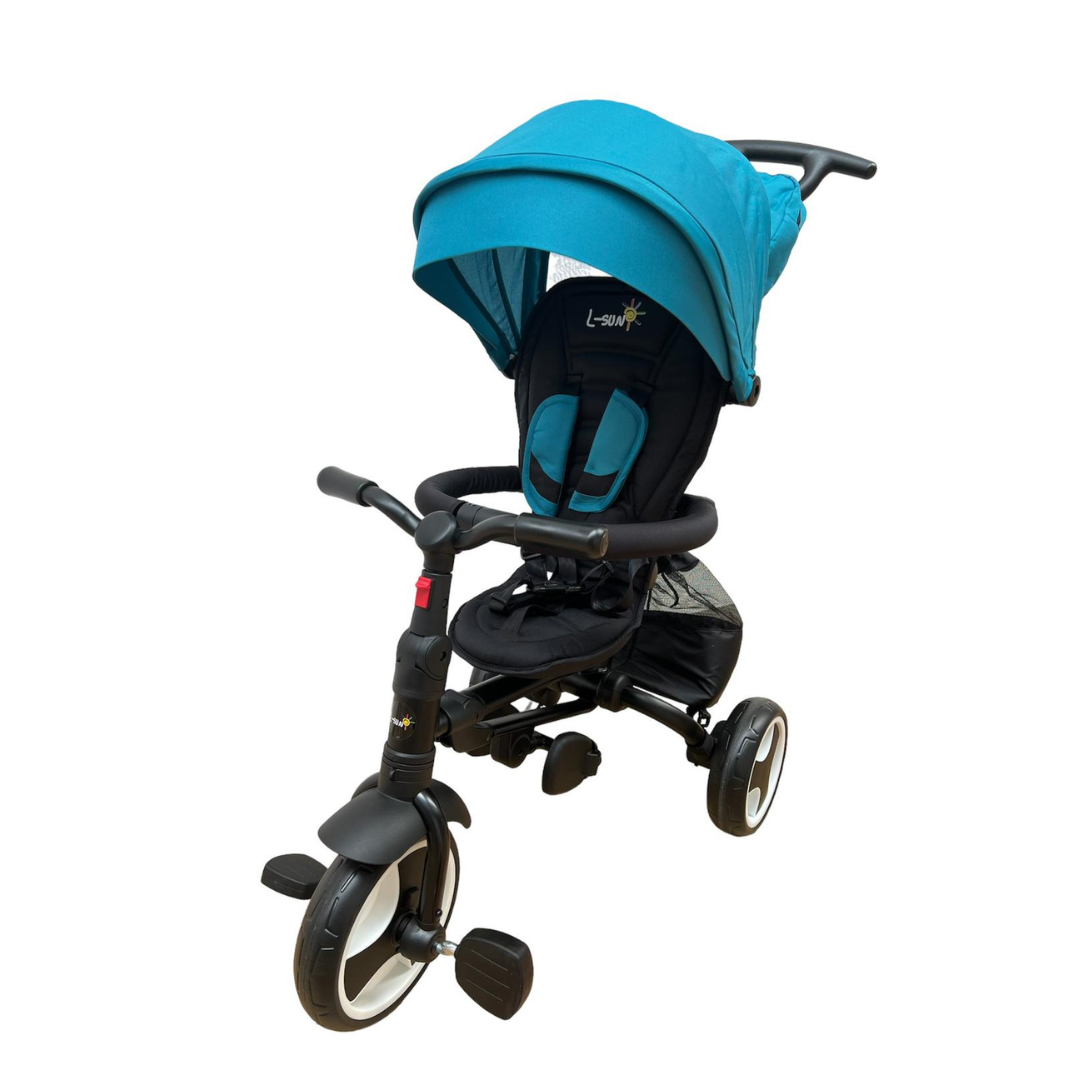 Tricicleta Ultrapliabilă și Multifuncțională L-Sun, cu scaun rotativ 360 și design într-o culoare vibrantă de albastru, redefinește plimbările cu cei mici, oferind o experiență de neuitat și confort maxim.